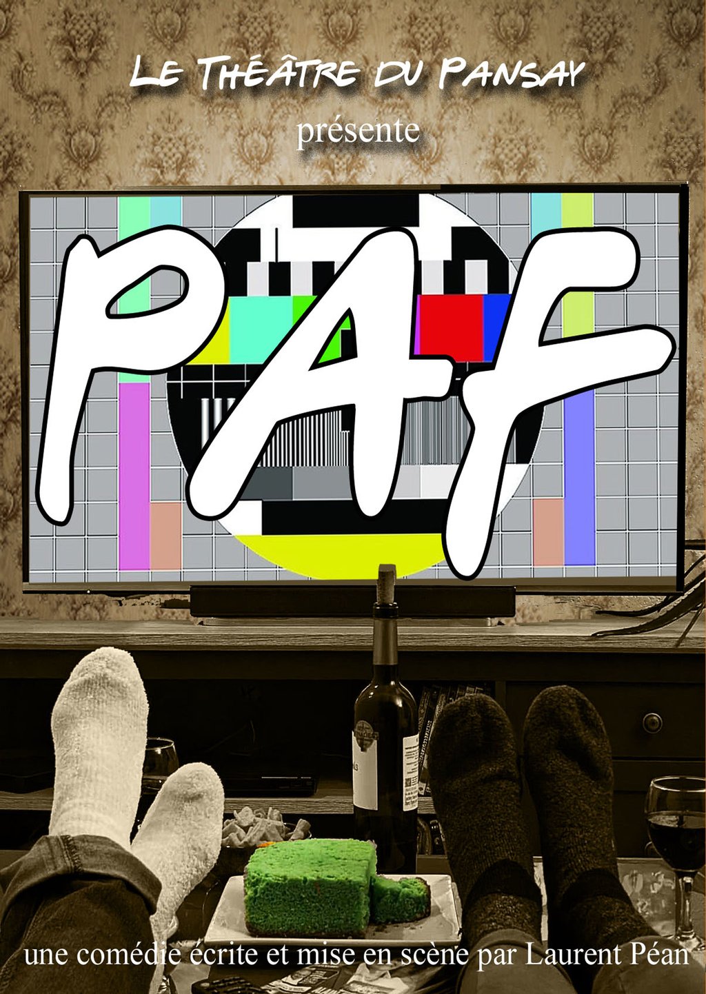 A cette heure où les écrans ont envahi notre quotidien, il me semblait intéressant pour la nouvelle création de la troupe, d’écrire une pièce autour de l’univers de la télévision. Et Paf ! La pièce P.A.F. est née. La troupe ayant un goût certain, ou un certain goût pour la comédie, je ne pouvais traiter de ce sujet que sur un ton humoristique en parodiant différents genres télévisuels allant du jeu télévisé à la série en passant par le reportage journalistique. Cette pièce a été expressément écrite pour la troupe en répondant à certaines de leurs envies comme, par exemple, la présence d’une scène de comédie musicale. Scène dans laquelle les grands fans de la troupe pourront remarquer un clin d’œil à la précédente pièce que j’avais écrite pour la compagnie en 2020 « La revanche du Pangolin » et qui a été montée en 2022.